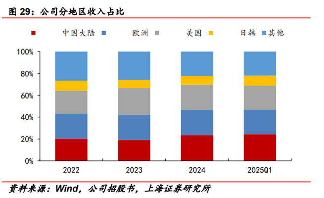 从区域地域来看,境外销售收入占比超75%,以欧美、日韩等发达国家(地区)为主。2022-2024年公司境外销售收入占比分别为79.43%、80.83%和76.35%。
