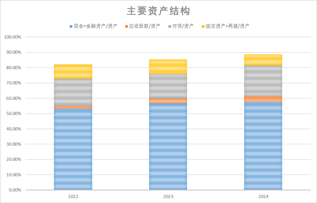 24年现金类资产约占比57%,应收4%,存货20%,固资7%,四项是最主要的资产。