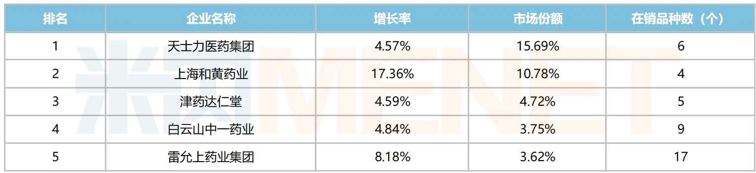 2025Q1~Q3中国公立医疗机构终端中成药丸剂企业销售额排名中,天士力、上海和黄药业、津药达仁堂、白云山中一药业、雷允上药业依次位列TOP5。五家企业销售额均实现同比正增长,TOP5企业市场份额合计接近40%。