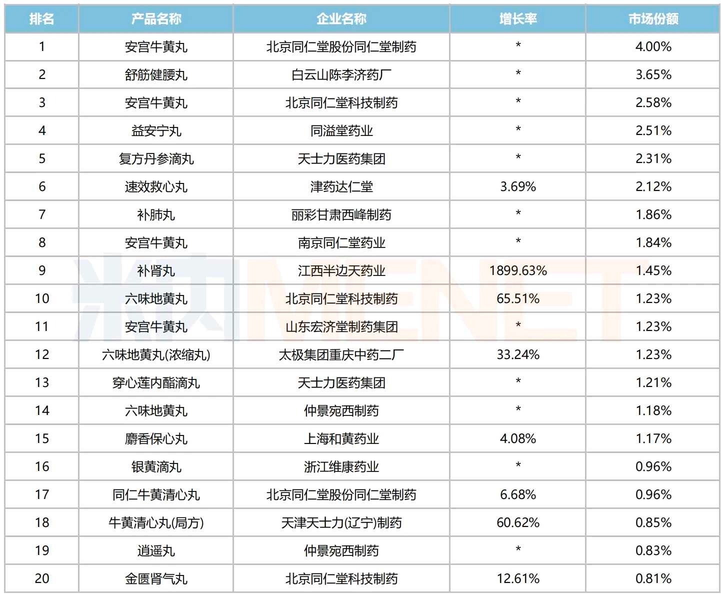 18个品牌销售额实现正增长,其中鲁南制药的脉络舒通丸、津药达仁堂的清咽滴丸和广誉远国药的定坤丹均涨超22%,上海和黄医药的麝香保心丸增长17.42%,雷允上药业的苏合香丸增长14.85%,天士力的养血清脑丸增长13.38%,白云山奇星药业的华佗再造丸和陕西郝其军制药的复方皂矾丸均涨逾10%。