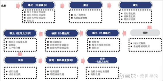从PCB(印制电路板,广泛应用于手机、电脑、汽车、服务器等各类电子产品及设备)的生产流程来看,从上游来料到加工成为可供终端用户使用的各类PCB产品,PCB厂商通常需要经历曝光、压合、钻孔、检测等多项工序。