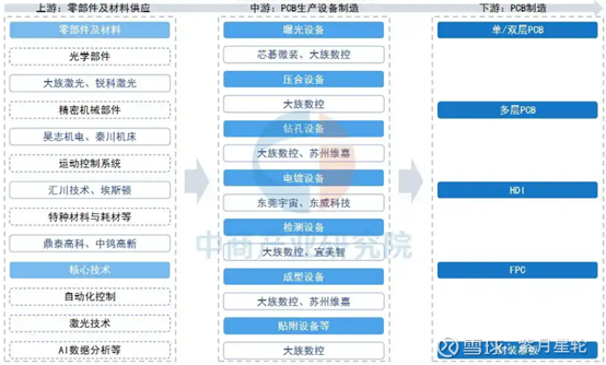 从PCB设备所处的产业链结构来看:产业链上游主要为零部件及材料供应环节,包括光学部件、精密机械部件、运动控制系统、特种材料与耗材等;产业链中游主要为PCB专用生产设备的制造环境,包括曝光设备、压合设备、钻孔设备、电镀设备、检测设备、成型设备以及贴附设备等;产业链下游主要为PCB的生产制造环节。