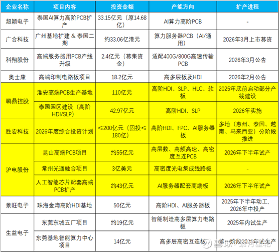 自2025年以来,PCB专用设备下游PCB制造领域在AI算力、AI端侧设备等新一代电子产品的需求拉动下,迎来了一轮大规模的“扩产潮”。以全球PCB龙头企业鹏鼎控股为例,其当前主要为苹果、华为等消费电子厂商提供消费电子用PCB产品,为紧跟时代潮流,其2025-2026年先后宣布了多个高阶PCB板扩产项目(包括在泰国投资42.97亿元建设高阶HDI/SLP项目,在淮安投资110亿元建设高阶PCB板项目);同期,业内PCB龙头企业胜宏科技、沪电股份、景旺电子、生益科技等也都公布了自己的产能扩张计划。