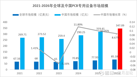 相比全球PCB专用设备市场,2025-2026年中国PCB专用设备领域的市场增长显然更为迅速,尤其在AI服务器、新能源汽车等需求推动下,高端PCB专用设备的市场需求持续增长。根据中商产业研究院预测,2024年中国PCB专用设备市场规模达到290.25亿元,较上年增长11.89%;2025年中国PCB专用设备市场规模约为319.41亿元,较2025年同比增长10.05%;预计到2026年,中国PCB专用设备市场规模将达到347.09亿元左右。