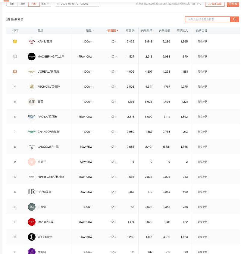 本月毛戈平冲到第二名,与辉同行带货贡献较大增量。欧莱雅重回前三,百雀羚冲到了第四,国货在抖音后劲依然很猛。