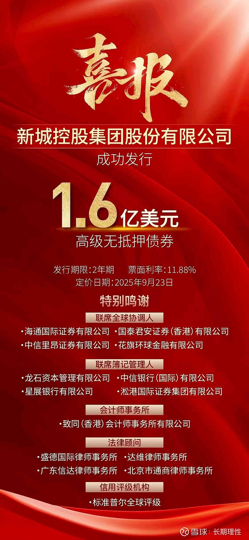 $新城控股(SH601155)$ 的母公司$新城发展(01030)$ 于2025年9月23日成功发行1.6亿美元高级无抵押美元债,最终利率11.88%,和上一笔持平。