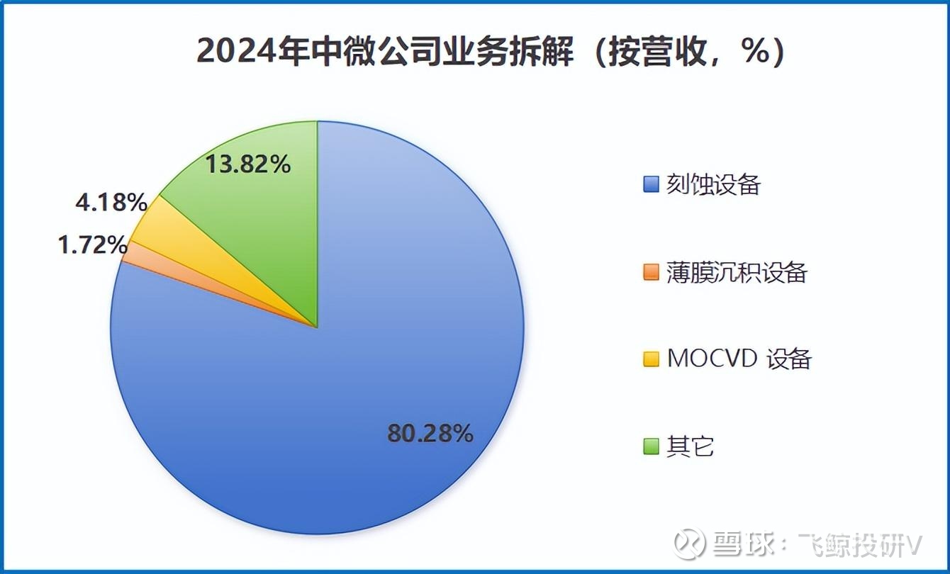 中微公司主攻刻蚀机领域,2024年刻蚀设备贡献销售额72.77 亿元,占到总营收的80%,是公司的核心业务和主要盈利点。
