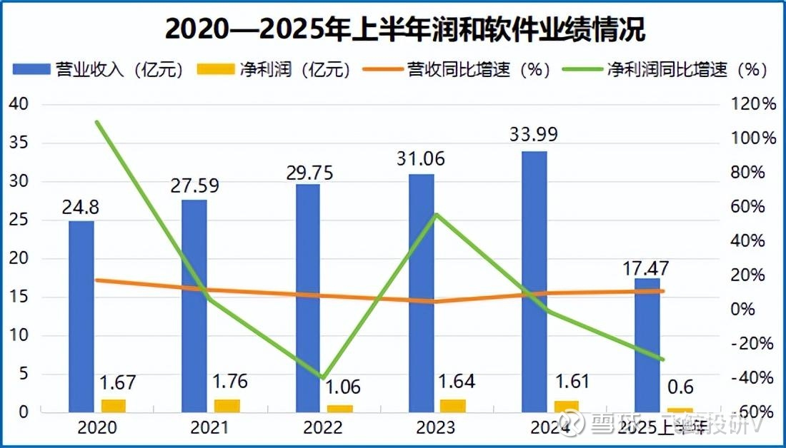 2020-2024年,润和软件营业收入一直保持着同比正增长,从24.8亿涨到33.99亿。到了2025年上半年,营收继续同比增长10.55%至17.47亿元。