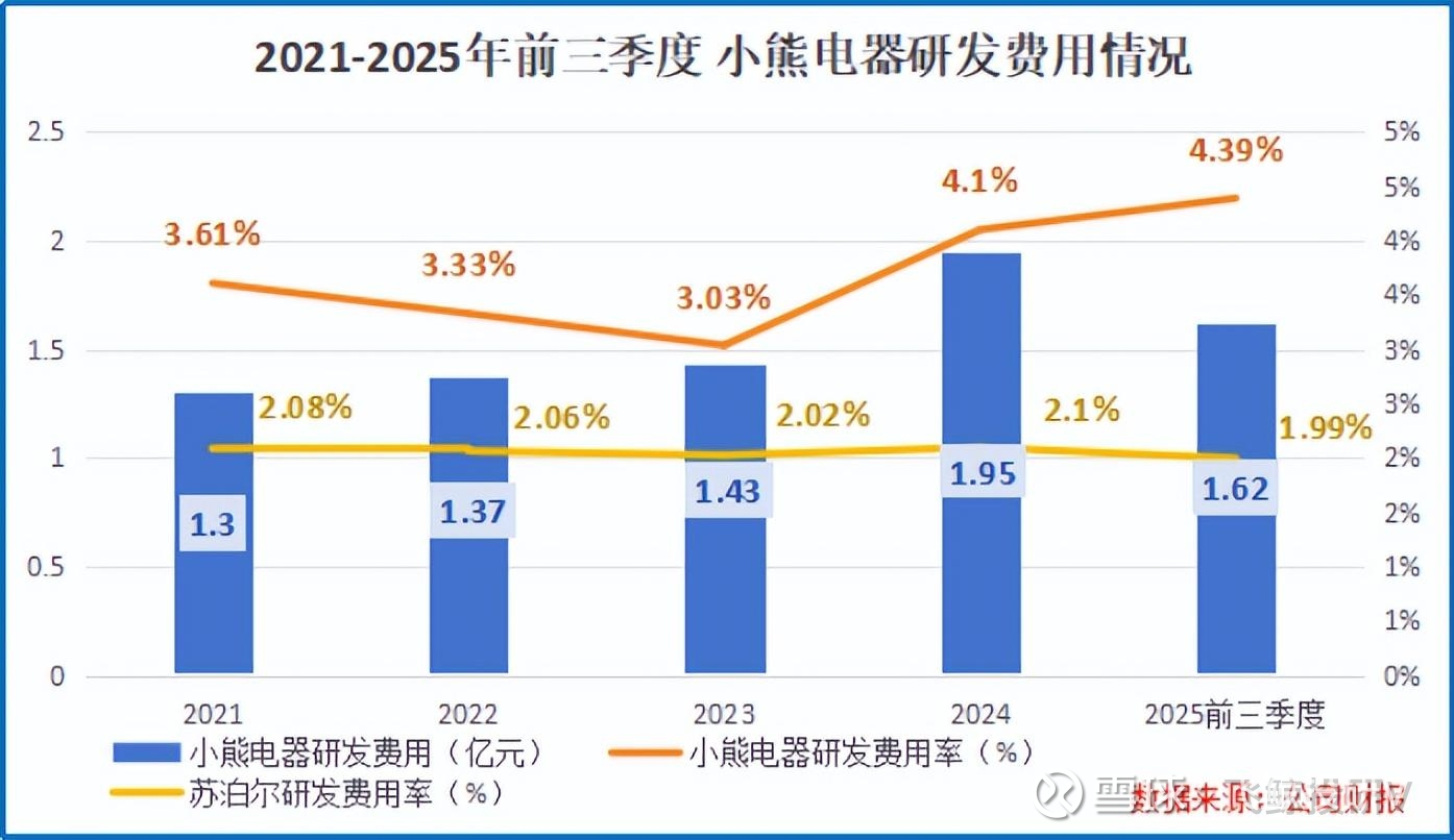 那一年,公司研发费用高达1.95亿元,研发费用率升至4.1%。2025年前三季度势头更猛,达到4.39%,远高于苏泊尔(2%左右)等同行。