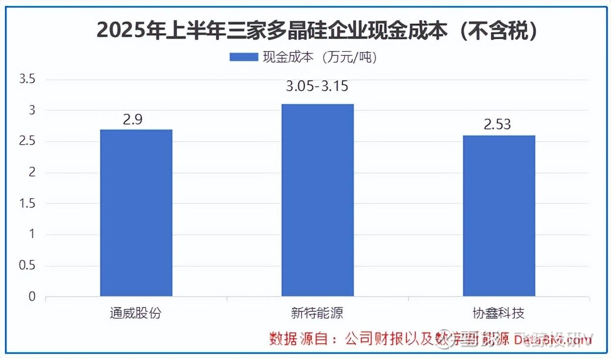 2025年上半年,新特能源现金成本维持在3.05-3.15万元/吨;通威股份现金成本则压至2.9万元/吨以下,内蒙古基地更是低至2.7万元/吨。