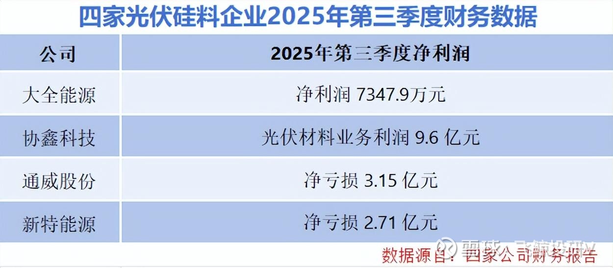 2025年第三季度,大全能源已实现7347.9万元的净利润,成功实现同比扭亏;通威股份虽未完全翻身,但净利润环比减亏86.68%。