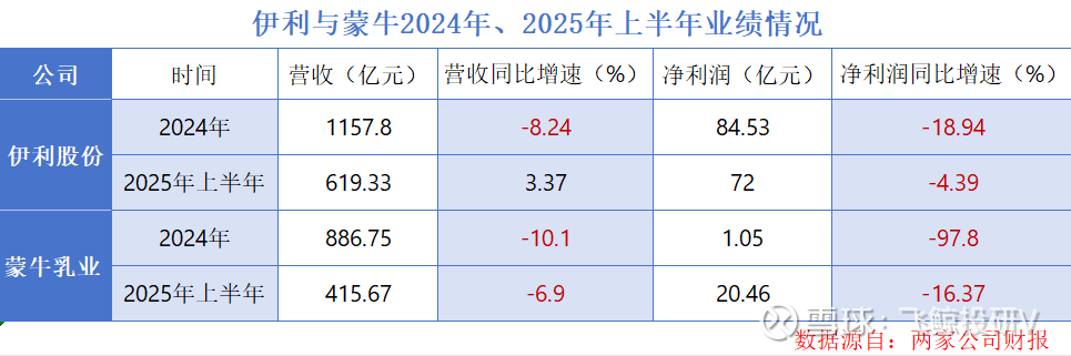 虽说伊利与蒙牛的营收规模早已拉开距离,但在此之前两家均保持着正向增长。然而 2024年,双雄业绩同步承压。