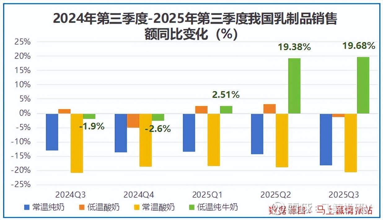 2025年第一季度,我国常温纯牛奶销售额同比下降13.44%,而低温纯牛奶销售额逆势增长2.51%,成为乳业市场中少有的增长亮点。