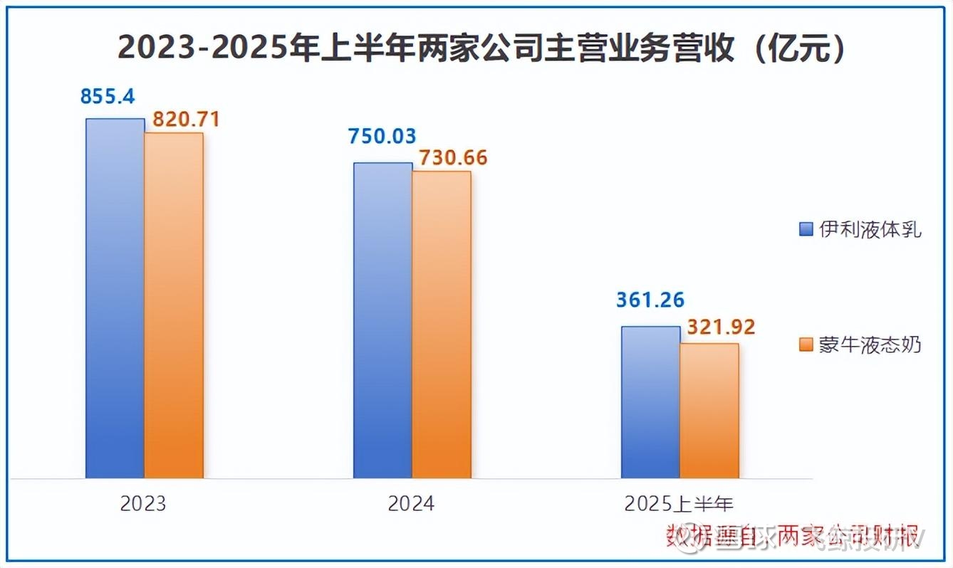 2024年,伊利液体乳营收从2023年的855亿元降至750亿元,同比下滑超100亿元;蒙牛液态奶收入也从821亿元缩水至731亿元,直接拉低了整体营收水平。
