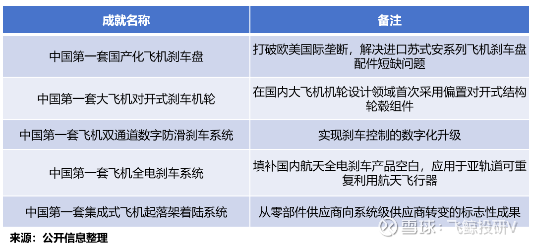 第一套国产化飞机刹车盘、第一套大飞机对开式刹车机轮、第一套飞机双通道数字防滑刹车系统、第一套飞机全电刹车系统以及第一套集成式飞机起落架着陆系统。