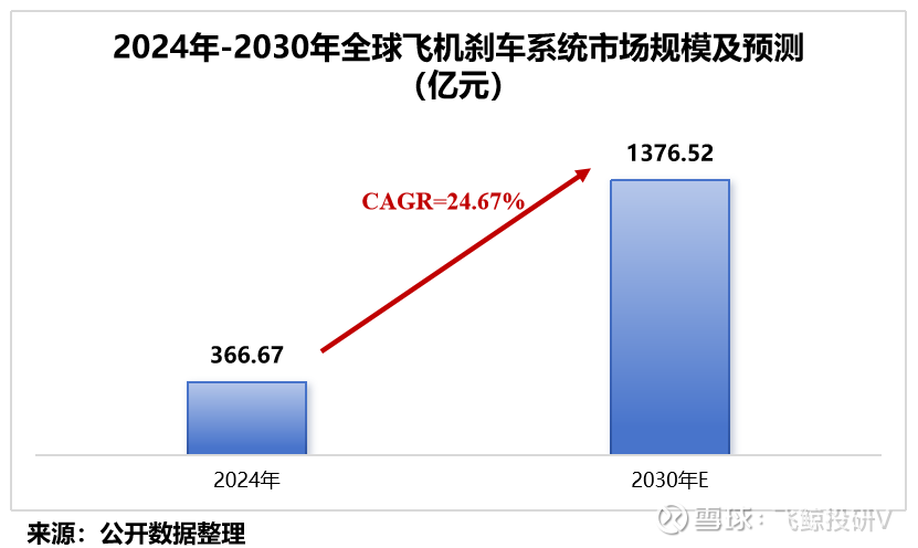 据预测,随着国产大飞机的爆发式增长和军机的更新换代,到2030年,全球飞机刹车系统市场的规模有望达1376.52亿元,年均复合增长率约24.67%。