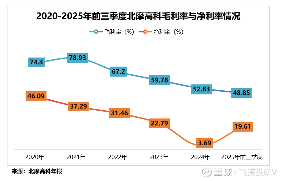 过去,北摩高科凭借深厚的技术壁垒,长期享有高产品溢价,毛利率常年维持在70%以上,净利率也稳居50%上下,堪称军工界的“茅台”。