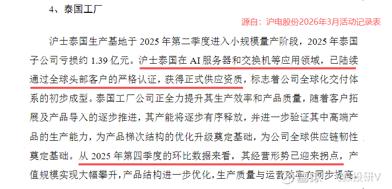 更值得一提的是,沪电股份海外泰国工厂产能也正逐步释放。尽管2025年该工厂亏损1.39亿元,但2025年第四季度环比数据显示,其经营形势已迎来拐点。