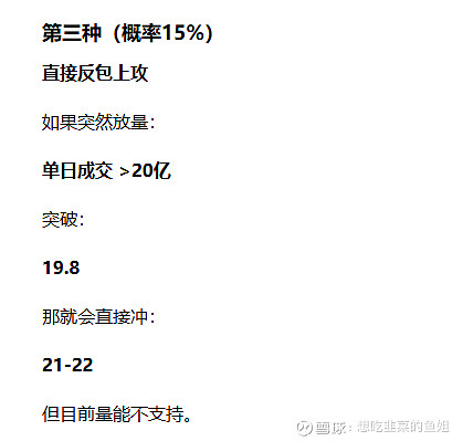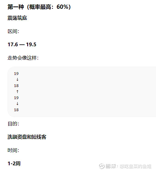 未来几天,量能最关键,如果出现:情况1,跌到 17.5,成交量<10亿,说明:洗盘。情况2,涨到 19.5,成交量>18亿,说明:主升第二波启动。