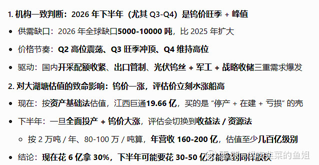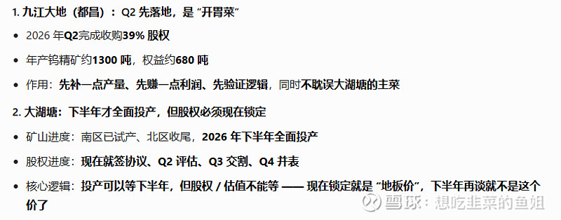 $江钨装备(SH600397)$ 也是19亿估值拿了30%股权,对一个100多亿市值的公司来说,这也是天大利好!矿山产出后,同等价格下,厦钨先拿 6 成,江钨拿 4 成,锁定长期稳定原料。直接锁定2万吨里面的40%就是8000吨原料!!