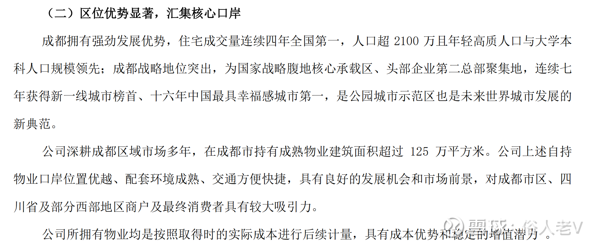 公司的核心优势,成都核心区位125万方的物业,按照目前的市值79.74亿计算,折合每平米6379元/平米。就算考虑综合体的商业折价,价格也不算高,这是该股票最大的吸引力。