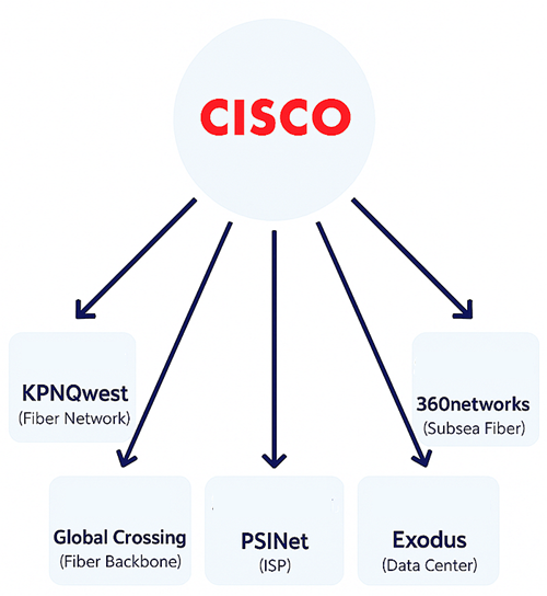 在1990年代末期,Cisco是全球最具代表性的網路設備供應商。為了推動銷售,它透過 Cisco Capital 等融資部門,向電信公司和新興網路服務商提供貸款或租賃方案。當科網泡沫破裂,這些客戶無法償還貸款,Cisco不僅失去銷售收入,還承受大量壞帳。
