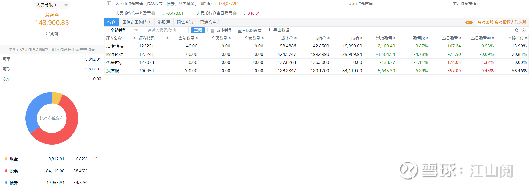 今天优彩转债持续拉高,逢高清仓了优彩转债,深信服也小幅拉升,继续持有未动。