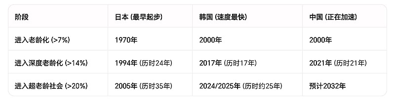 韩国,日本,中国三国的老龄化节点对比