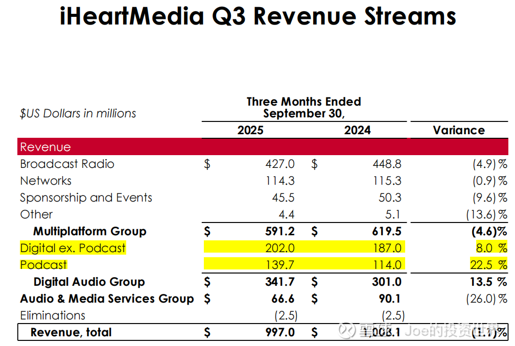 整体来看,iHeart仍处于传统业务转型(MPG部门大量裁员)和高额债务困境期(债务成本显著高于Siri),Q3亮点还是播客带来的结构性增长,其中地方广告代表的长尾市场是个值得关注的点。