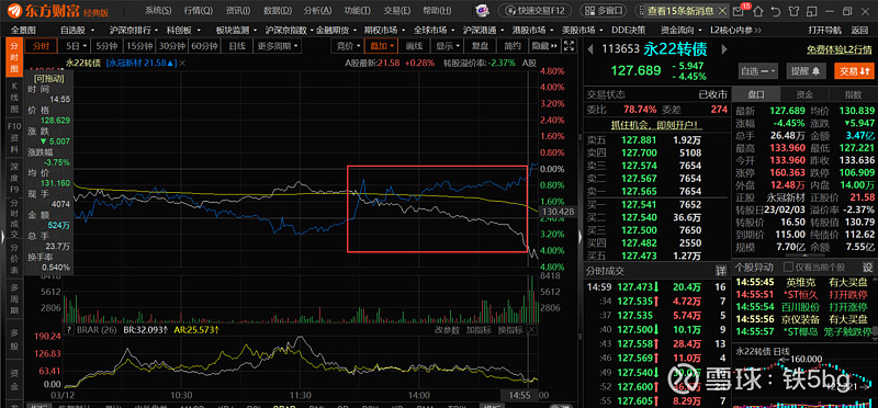 昨天收盘前5分钟,股价被强拉到强赎价以上,其实从分时图上看,迹象是很明显的,分钟成交放量20倍以上