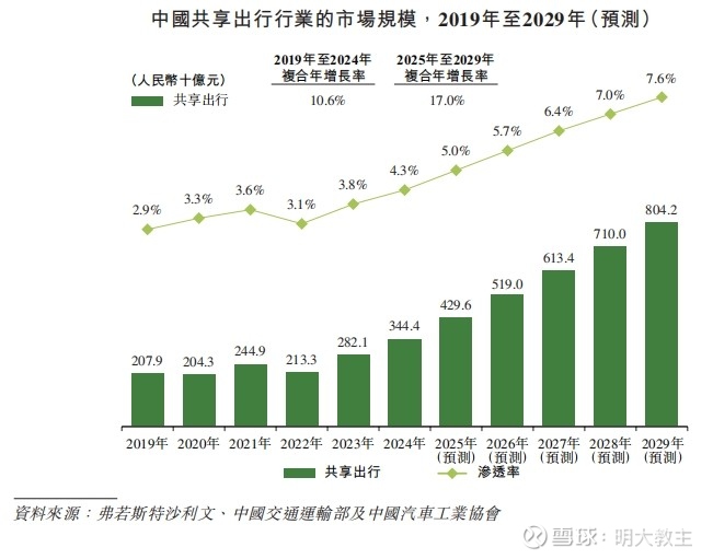 弗若斯特沙利文统计,2019-2024年我国共享出行市场规模年化增长率10.6%。至2024年我国共享出行市场规模已有3444亿元,占国内出行总市场的4.3%。