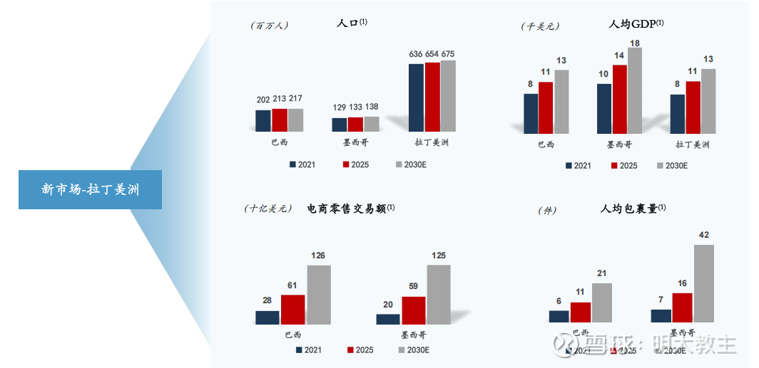 弗若斯特沙利文预计巴西、墨西哥电商GMV将由2025年的610亿美元和590亿美元增至2030年的1260亿美元和1250亿美元。
