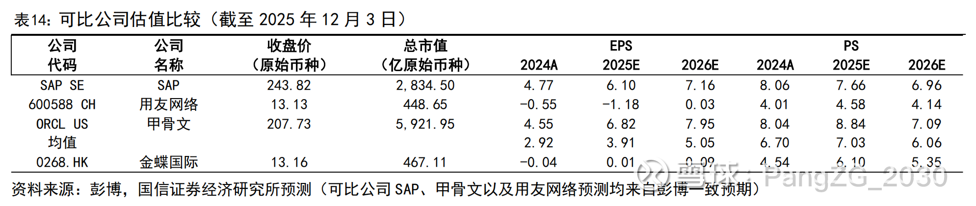 6、对标企业,国内主要是 用友、浪潮,国外是 SAP、Oralce。对企业估值,因当前未盈利(预计26年将 扭亏为盈),因此不使用PE,采用PS法。