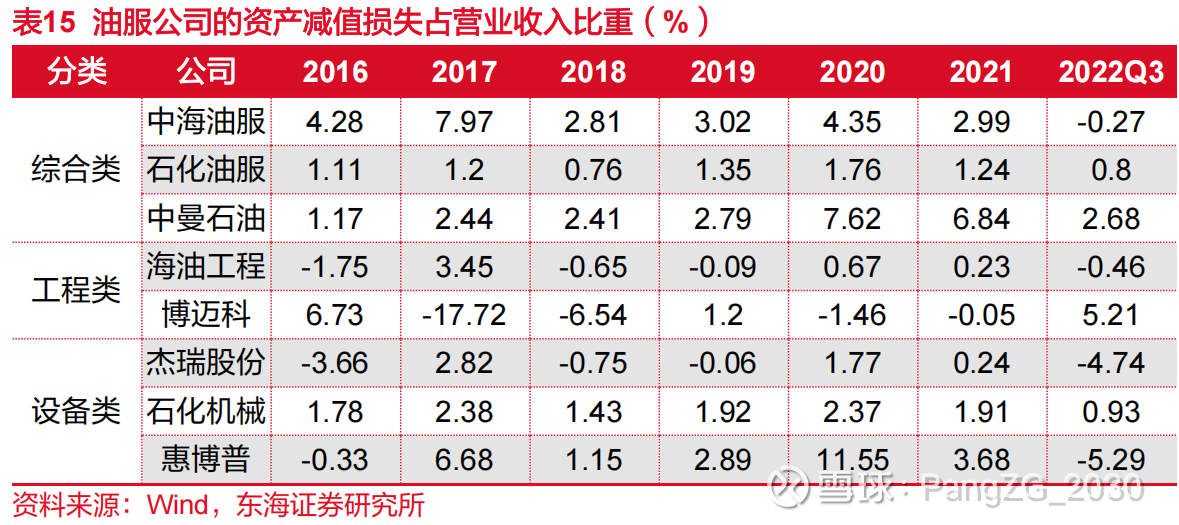 不同类型油服公司中,综合类油服固定资产占比最高,中海油服 2018 年固定资产占比高达 65.96%,2022 年 Q3 已下降至 52.66%;工程类油服次之,海油工程、博迈科固定资产比重目前已维持在 30%以下;设备类油服固定资产比重相对较轻,目前已降至 10%以下,“轻资产”战略下资产减值损失占营收比重下降,进一步加强国内油服行业成本优势。