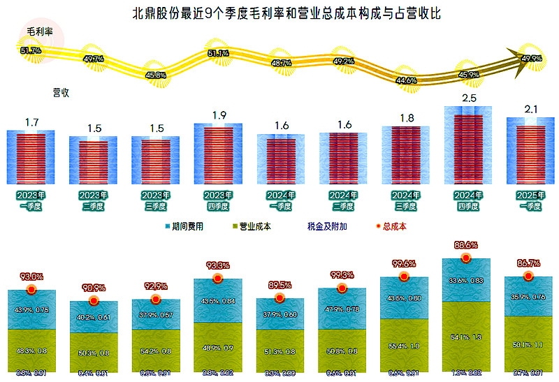 高毛利率一般会有高销售费用占营收比,北鼎股份正是如此。销售费用占营收比高的年份超过三成,低的时候也接近三成,这就导致期间费用占营收比最近三年都超过了四成。2025年一季度只有35.9%,比前四年都低;不过这一行的季节性因素影响比较大,一般存在四季度费用偏高的问题,关键还得看全年数据。
