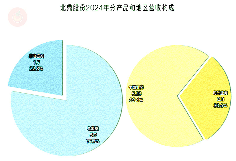 电器类是其核心业务,占比近八成;国内市场占比近七成,是核心市场,有三成出头的业务由海外市场贡献。