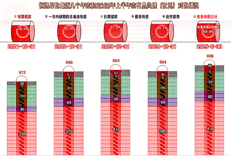 恒逸石化的有息负债近700亿元,总体上呈增长趋势。2024年的财务费用下降,部分原因是有息负债规模略有下降,更大的原因可能是融资成本,也就是市场利率有所下降。但是,2025年上半年末的有息负债又恢复增长了,虽然和两大同行的负债水平比,恒逸石化的有息负债只是别人的零头,但其资产规模等也更小,仍然是极重的财务负担。
