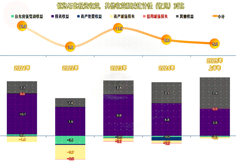 恒逸石化在其他收益方面是在赚大钱的,最近两年半都是靠此实现盈利的,因为正是其填平了主营业务方面所亏损的,不到1个百分点的坑。和同行们政府补助高类似,但其还有一项更高的“投资收益”,主要是“对联营企业和合营企业的投资收益”。具体说前几年主要是对“浙商银行”投资产生的收益较高,2025年上半年并不是,而是主要来自于以前确认过损失的其他联营企业,估计全年的来源情况,会和上半年有较大差异。