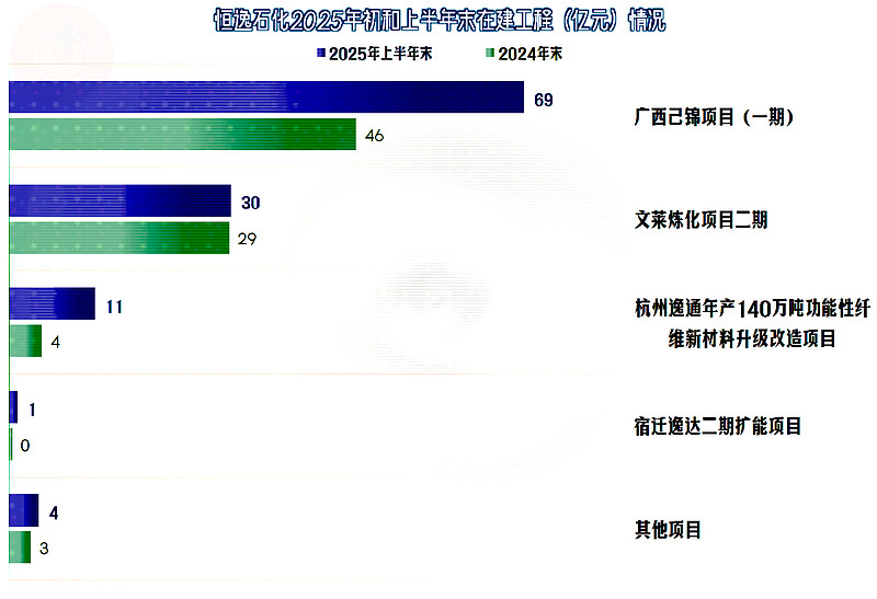 “广西己锦项目(一期)”预算105亿元,工程进度为80%,需要的投入已经不是太多了;“文莱炼化项目二期”预算为136.5亿美元,工程进度仅为3%,后续需要的投入就会相当大。“杭州逸通年产140万吨功能性纤维新材料升级改造项目”的预算为30亿元,“宿迁逸达二期扩能项目”的预算为3.9亿元,这两个项目的工程进度分别为65%和31%,就算还需要投入,这类项目的资金需求也不会太高,至少不能和百亿美元的项目去比。