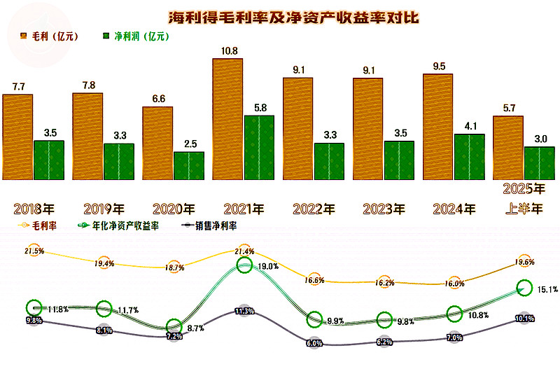2025年上半年的毛利率反弹,有跳出前三年较低区间的迹象,销售净利率已经和2021年差得不多了,但净资产收益率还差得相对比较多。事隔三年后,净资产的规模又累积了一些,要赚更多的钱,才能达到当年的收益水平了。