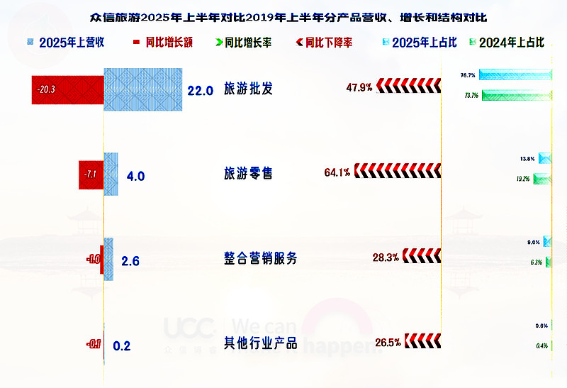我们把其与疫情前的2019年上半年做一个分产品的对比,由于时隔六年,业务分类上略有差异,我们做了一定的调整后,数据基本可比。前两大业务都才恢复至当年一半的水平,特别是“旅游零售”业务,还没有恢复至当年的四成,“旅游批发”业务恢复过半,其他两项相对较小的业务,恢复得相对更好一些。