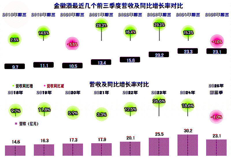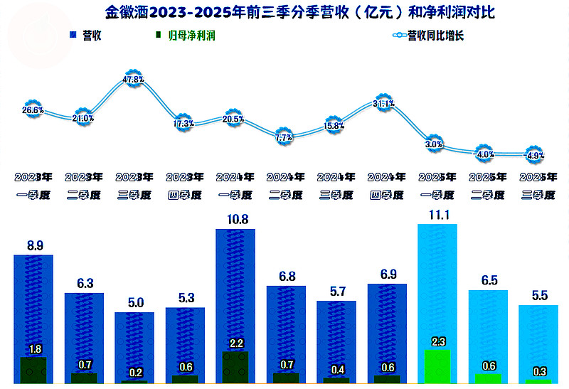 2025年前三季度,金徽酒的营收同比下跌1%,这是多年不见的下跌。就算2020年前三季度也有过下跌,但全年也转为增长,而且大家都知道,那是疫情突然爆发所带来的暂时影响。