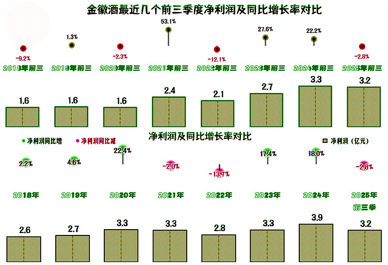一季度是金徽酒的传统旺季,营收最高,一半左右的净利润都由该季度贡献;三季度一般是淡季,营收和净利润都相对较低,前三季度已经包含了旺季和淡季,其收益率水平可能会略高于全年平均,也就是说,用2025年前三季度和以前的几个全年相比,可能并没有包含太多的季节性因素影响。