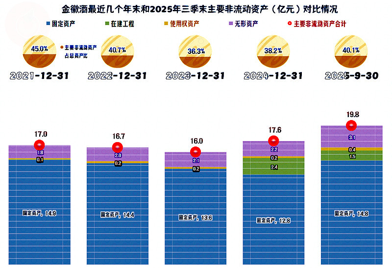 金徽酒前几年的固定资产规模持续下降,2025年末增长后的水平和2022年末差不多,实际上还略差了一点。在建工程中还有部分会在未来转入固定资产,如果其建成的速度快于折旧,固定资产也会略有上升,但并不是特别明显,何况后续期间还会下降呢。
