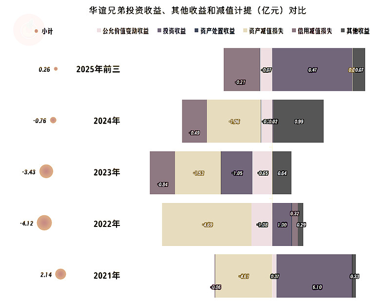 除2025年前三季度之外,华谊兄弟每年在其他收益方面都是净损失的状态,特别是2023年及以前的几年,净损失还相当严重。主要是“资产减值损失”,从2023年以来的“信用减值损失”也不低,收益项主要是“投资收益”。