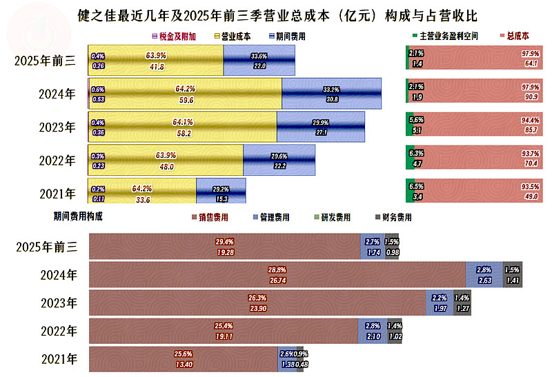 2023年的主营业务盈利空间还有5.6个百分点,2024年和2025年前三季度已经下跌至仅为2.1个百分点了,几乎所有的影响都来自于期间费用占营收比的上升。