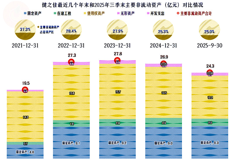 固定资产的规模稳定在9亿元左右,在建工程约2亿元,这个期末的变化不大。主要的波动是“使用权资产”,从2024年末开始下降,2025年三季度末大幅下降。2024年末的下降,应该与平均租金下降有关,当时的门店数还在增长;2025年三季度末的下降就是数量和单价都在降了。看起来经营成本下降是好事,真是理论上的“弯道超车”好时机,但前提条件是需求要增长,然而,需求增长却很难在现在的环境下产生。