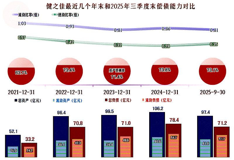 健之佳的资产负债率不低,长期偿债能力一般,流动比率偏低,特别是速动比率极低,前几年的财务战略还是过于激进了。