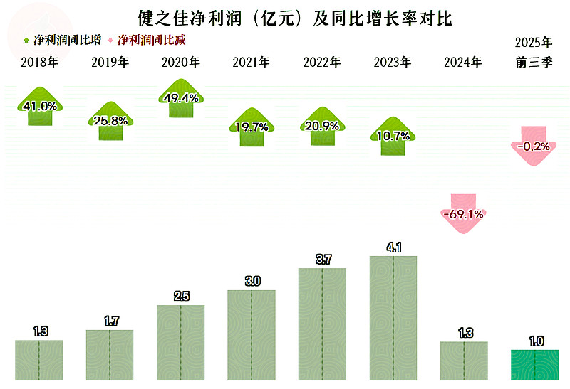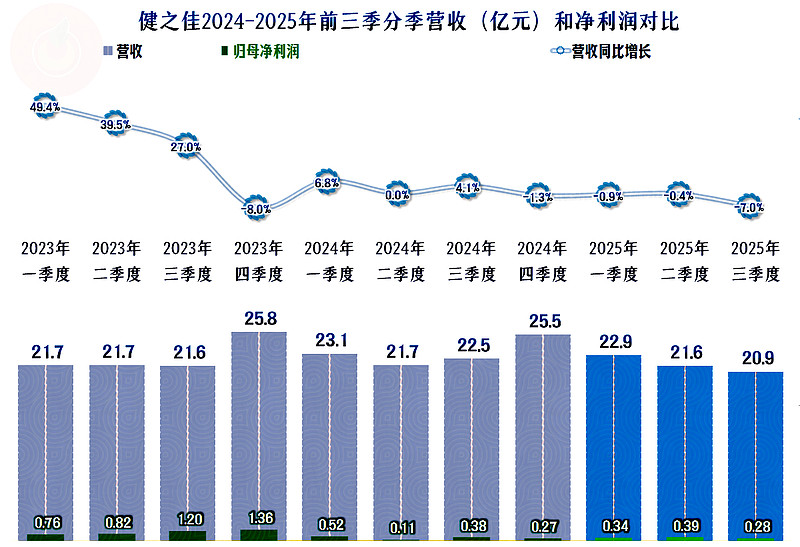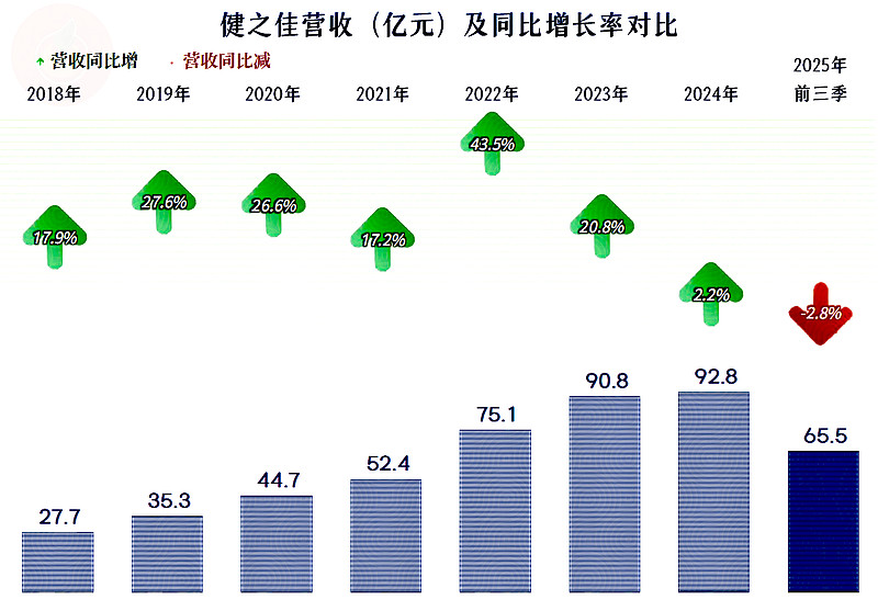 2025年前三季度,健之佳的营收同比下跌2.8%,这是其有公开数据以来首次出现下跌。实际上,这样的表现并不让人意外,因为其2024年的营收增长就下跌至2.2%,结束了长达多年两成左右,甚至更高水平的增长速度。