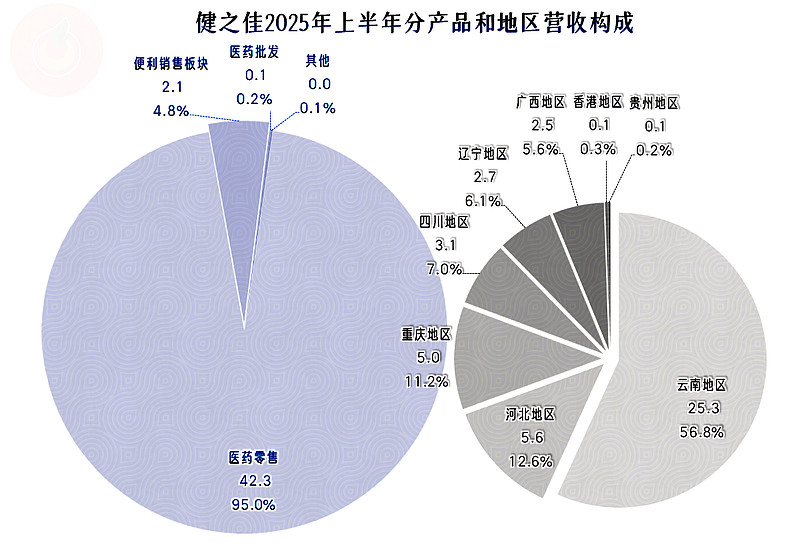 健之佳的主要业务是“医药零售”,占比达95%,“便利销售”、“医药批发”和其他业务占了另外的5%。占比过半的市场在其大本营云南省,河北和重庆市场占比超一成,四川、辽宁和广西市场占比超5%,在香港和贵州市场也有少量的收入。
